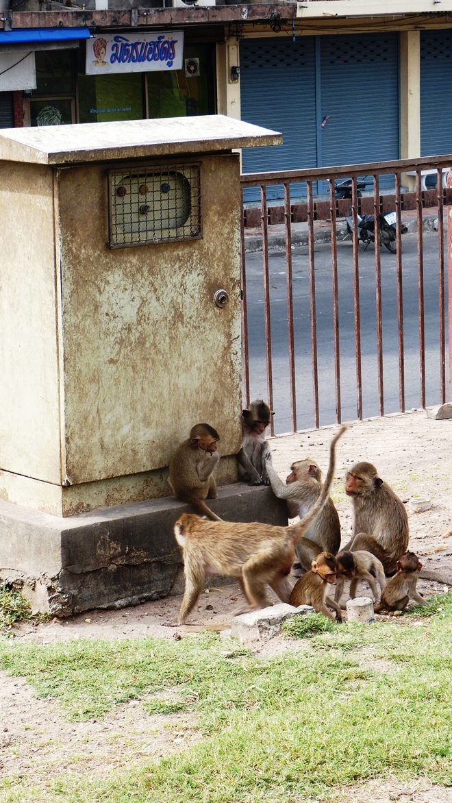 Mais les singes dans tout ça? Patience, il suffit de marcher quelques mètres dans la rue longeant la gare (Na Sanprakan Road) pour commencer à apercevoir les singes en liberté. Qu’ils soient sur les voitures, sur les trottoirs, aux fenêtres des maisons ou sur les câbles électriques, ils sont partout :).